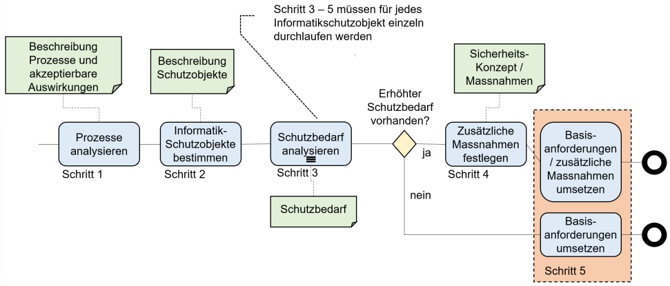 Zunächst wird ein Datenverzeichnis erstellt, in dem die relevanten Datengruppen strukturiert erfasst werden. Anschliessend wird qualitativ beurteilt, welche Auswirkungen eine Verletzung der IT-Schutzziele – insbesondere Vertraulichkeit, Integrität und Verfügbarkeit – auf die Prozesse hätte. Führt eine solche Verletzung zu nicht akzeptablen Abweichungen, gilt der Schutzbedarf als erhöht. Am Schluss muss eine Schutzbedarfsanalyse im Hinblick auf Plausibilität und Konsistenz geprüft werden.