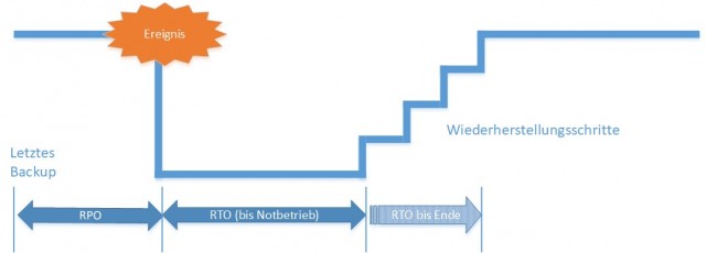 - RTO (Recovery Time Objective): Wie lange darf ein Geschäftsprozess/System ausfallen? Es ist also der Zeitbedarf, der vom Zeitpunkt des Schadens bis zur vollständigen Wiederherstellung der Geschäftsprozesse reicht.