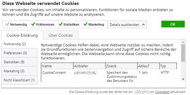 Hier ist auf einen Blick ersichtlich, welche Cookies, für was und wie lange dieses gespeichert wird, ersichtlich. Einzelne Cookies können gruppenweise deaktiviert werden.
