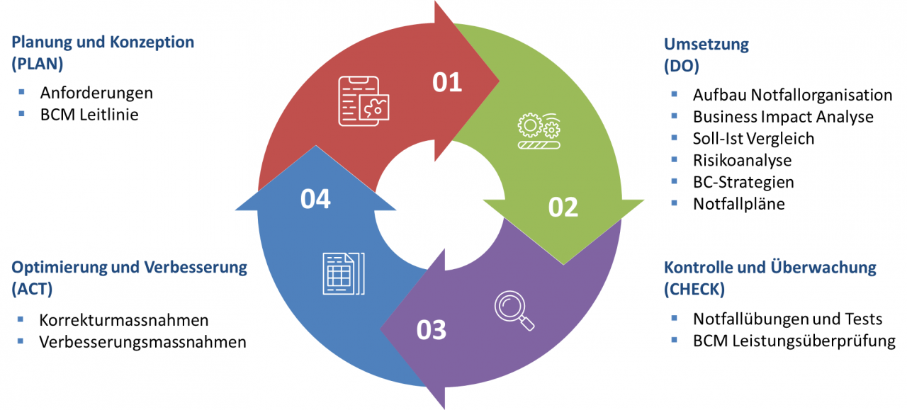Mit den Resultaten geht es an die Pläne und Verfahren zur Aufrechterhaltung der Betriebsfähigkeit. Das Unternehmen muss Strukturen umsetzen und aufrechterhalten, die eine zeitnahe Warnung an und Kommunikation mit den relevanten interessierten Parteien ermöglicht. Sie muss Pläne und Verfahren für die Steuerung des Unternehmens und ihrer Prozesse während einer Störung bereitstellen. Die Pläne und Verfahren müssen verwendet werden, wenn dies zur Aktivierung von Lösungen zur Aufrechterhaltung der Betriebsfähigkeit erforderlich ist. Diese Pläne gilt es regelmässig zu testen und an die Veränderungen anzupassen.