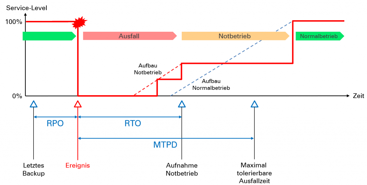 - RTO (Recovery Time Objective): beschreibt die Zeitspanne, bis der Prozess seinen Betrieb wieder aufnehmen kann. Der Betrieb darf allerdings eingeschränkt sein (Notbetrieb). Das RTO für einen Prozess muss kleiner sein als die entsprechende MTPD.