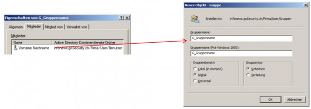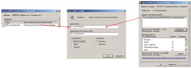 Für das gewünschte Verzeichnis wird eine Domain-Lokale Gruppe erstellt. Die im ersten Schritt erstellte globale Gruppe wird nun dieser Domain-lokalen Gruppe zugewiesen. Auf diese können die Berechtigungen gesetzt werden.