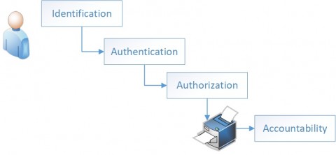 In einem ersten Schritt erfolgt die Identifikation der Person. Das kann ein Benutzername oder eine eindeutige ID sein. Im zweiten Schritt wird überprüft, ob dies auch stimmt, zum Beispiel mit der Eingabe eines Passwortes oder einem biometrischen Merkmal (Fingerprint, Augen, Venen, etc.). Nun weiss das System, wer sich angemeldet hat. Im dritten Schritt werden Zugriffe bzw. Rechte gewährt; im obenstehenden Bild das Recht etwas auszudrucken. Immer wichtiger wird das dritte A: die Nachvollziehbarkeit. In einem Log wird jeder Zugriff gespeichert und kann später ausgewertet werden.