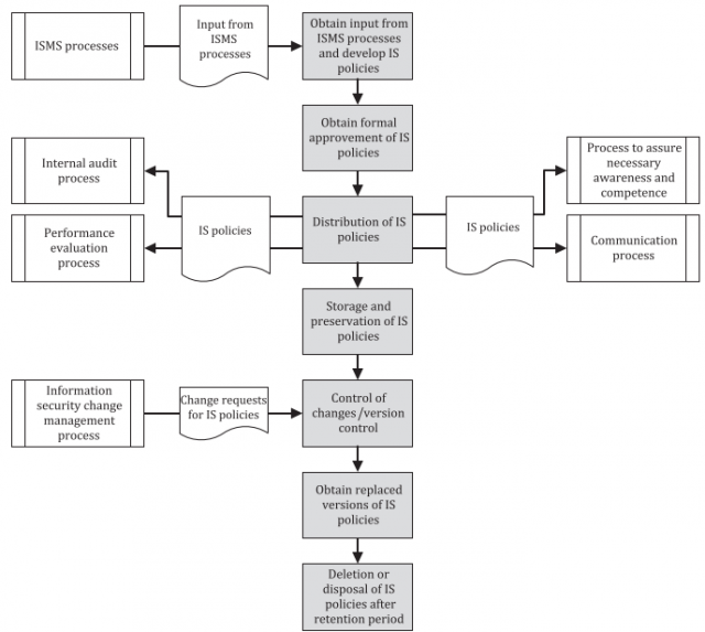 Die Prozessinputs sind hier fast selbstsprechend: von allen anderen Informationssicherheitsprozessen (als Grundlage für Richtlinien) und aus dem Änderungsmanagementprozess. Das Resultat sind dann geeignete Richtlinie für den Kommunikationsprozess, den internen Auditprozess, die Leistungsbewertung, Aufzeichnungskontrolle und den Prozess zur Sicherstellung des notwendigen Bewusstseins und Kompetenz.
