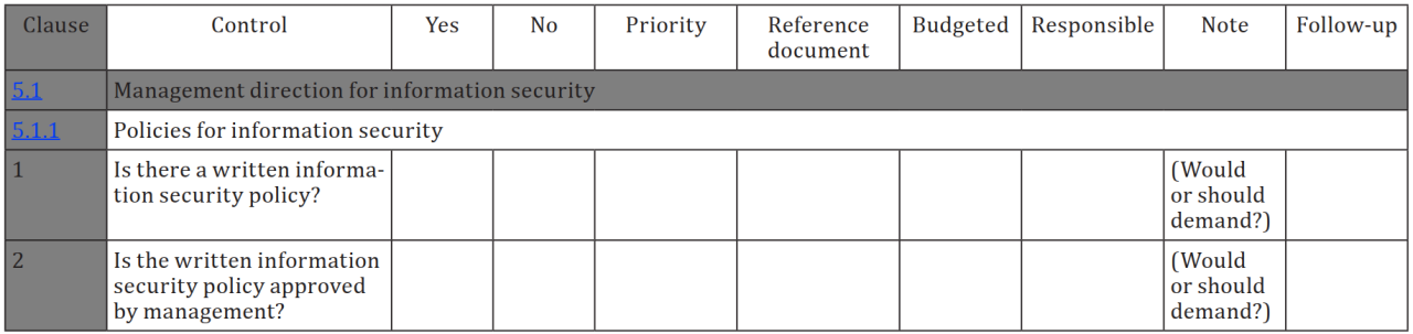 - Frage (z.B. Gibt es eine schriftliche Informationssicherheitspolitik?)