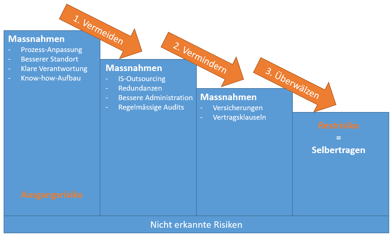 - Risikovermeidung durch Prozess-Anpassungen, anderer Standort, klare Verantwortlichkeiten, Aufbau von eigenem Know-how oder der Beendigung einer Geschäftsaktivität, welche dieses Risiko verursacht