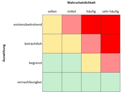 Die beiden erwähnten Achsen sind die Eintritts-Wahrscheinlichkeit und die Auswirkung. Bei einem 4x4-Modell könnten diese beispielsweise so aussehen: